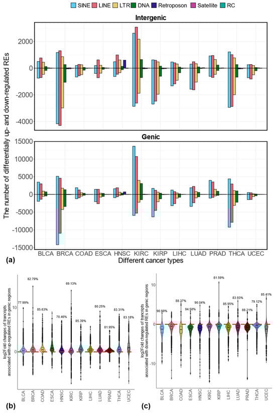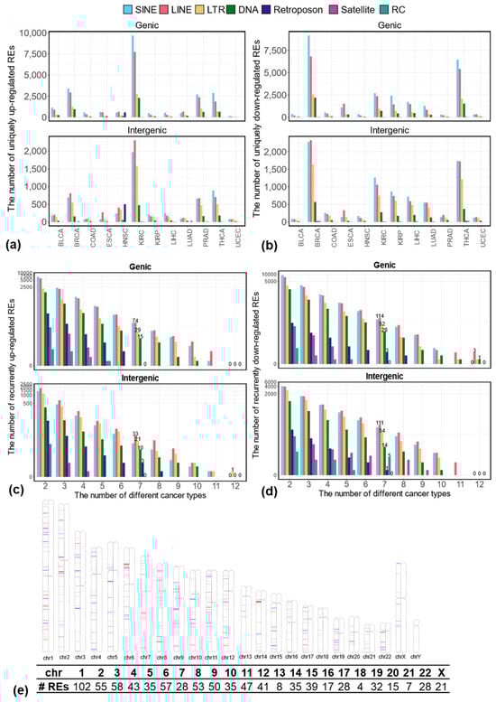 To identify REs uniquely differentially expressed in each cancer type, we analyzed the differentially expressed REs identified in each of the 12 cancer types (see the details in Table S3–S14 for uniquely dysregulated REs in BLCA, BRCA, COAD, ESCA, HNSC, KIRC, KIRP, LIHC, LUAD, PRAD, THCA, and UCEC, respectively). This analysis revealed that each cancer type exhibits a distinct pattern of RE dysregulation, with unique sets of REs being up- or down-regulated. Figure 2a,b summarize the number of uniquely up- and down-regulated REs stratified by their genomic context (genic vs. intergenic) in each cancer type. As expected, KIRC, which had the highest overall number of up-regulated REs, also exhibited the most uniquely up-regulated REs, primarily in genic regions. Similarly, BRCA and THCA demonstrated the highest number of uniquely down-regulated REs, predominantly within genic regions.