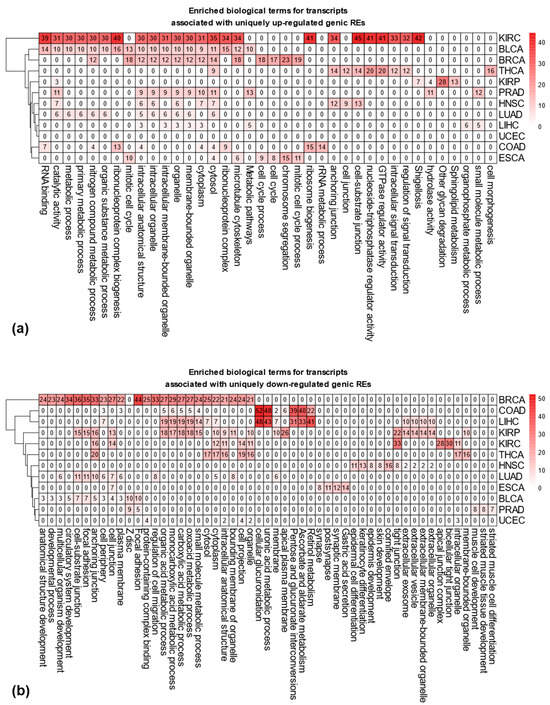 In terms of uniquely up-regulated genic REs, as shown in Figure 3a, among a total of 38 (i.e., union of the top 5 enriched terms from all 12 cancers) functional terms, 24 are significantly enriched in KIRC, followed by 18 terms in BLCA and 14 terms in BRCA. Notably, UCEC lacked enriched terms. Namely, genes associated with uniquely up-regulated genic REs in UCEC do not contain any enriched terms from GO and Pathway databases. Interestingly, BRCA and ESCA are enriched in the terms related to the cell cycle process, whereas KIRC, BLCA, BRCA, PRAD, HNSC, LUAD, and LIHC show enrichment in intracellular structures, with KIRC and THCA also displaying enriched terms in signal transduction pathways. Among 53 functional terms associated with uniquely down-regulated genic REs, BRCA have the most enriched terms (24), followed by KIRP (21). ESCA, PRAD, and UCEC each have five enriched terms (Figure 3b). BRCA, KIRP, LUAD, BLCA and, to a lesser extent, KIRC, THCA, and ESCA all display enrichment in cell junctions. COAD and LIHC show enrichment in distinct pathways, including cellular glucuronidation, uronic acid metabolic process, pentose and glucuronate interconversion, ascorbate, aldarate, and retinol metabolism.