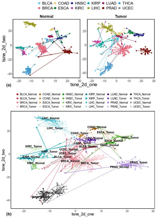 REs that are uniquely differentially expressed in each cancer may represent the unique characteristics of that cancer. To assess the potential use of uniquely differentially expressed REs as cancer-type representations, we focused on intergenic REs to minimize confounding effects from associated transcripts. We used t-SNE [] to visualize the normalized expression of these REs, including uniquely up-regulated, down-regulated, and combined sets. Briefly, the normalized expressions of uniquely up- or down-regulated intergenic REs, as well as the combination of them, were used as the feature inputs to t-SNE to cluster different sample types (including different normal samples, different tumor samples, and different normal and tumor samples), as shown in Figure 4. Specifically, totals of 17,541 uniquely up-regulated intergenic REs, 24,351 uniquely down-regulated intergenic REs, as well as 38,899 uniquely dysregulated intergenic REs (i.e., the union of up-regulated and down-regulated REs; there are 2993 REs that overlap between uniquely up-regulated and down-regulated REs because some of the uniquely up-regulated REs in one cancer can be down-regulated in other cancers) were used as the input for t-SNE visualizations (see Figure 4a,b and Figure S5a–f). Clearly, Figure 4 demonstrates the clustering of different sample types (normal, tumor, and combinations) based on these REs. Notably, uniquely up-regulated intergenic REs effectively differentiate sample types with different tissue origins for both normal and tumor samples, as shown in Figure 4a. Interestingly, the tumors and their matched normal samples are close together. Still, they are distinct from other sample types in this two-dimensional latent space when these uniquely up-regulated intergenic REs are used to cluster different normal and tumor samples, as shown in Figure 4b. Similar trends were observed with uniquely down-regulated and combined intergenic REs (Figure S5c–f).