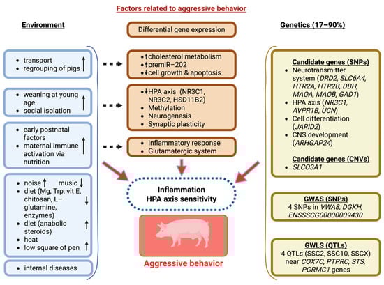 The hypothalamic–pituitary–adrenal (HPA) axis is a key system involved in the regulation of aggressive behaviour in mammals, including pigs. This axis is involved in the regulation of the body’s stress response, and it is hypothesized that the stress response and the manifestation of aggression are interrelated in pigs. Several studies have aimed to identify genetic markers on the HPA axis that are potentially associated with the level of aggression in pigs. An analysis of 10 polymorphic variants of HPA axis genes (CRH, CRHR1, CRHBP, POMC, MC2R, NR3C1, AVP, AVPR1B, UCN, and CRHR2) [74] demonstrated the association between the c.*2122A>G in the glucocorticoid receptor gene (NR3C1) and increased cortisol concentration, increased adrenal gland mass, and a higher number of body injuries in animals. Analogous associations for SNPs were demonstrated in the arginine-vasopressin 1B receptor gene (AVPR1B, c.1084A>G) and in the urocortin gene (UCN, g.1329T>C). The results obtained are to some extent consistent with the previously demonstrated effect of the AVPR1B and NR3C1 genes on the manifestation of aggression in humans [75,76]. The function of the HPA axis is also associated with a mutation in the RYR1 gene (c.1843C>T), which determines the development of porcine stress syndrome [77].