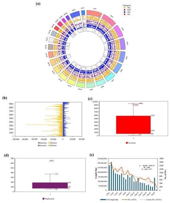 Furthermore, an analysis of the distribution of SVs across the 24 chromosomes revealed a strong correlation between the length of our assembled chromosome and the number of SVs (R2 = 0.83, P = 4.59 × 10−5) (Figure 1e). This pattern has also been observed in a previous study [47].
