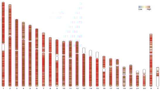 De novo assembly of the VHG genome compared to hg38. Super scaffolds in VHG1.1 are assigned to hg38 based on alignment data set by Lastz and visualization by KaryotypeR. The color segments present low to high percentage sequence identity of VHG1.1 sequence aligning to hg38 reference. The absence sequences are labeled by the white segments on each chromosome.