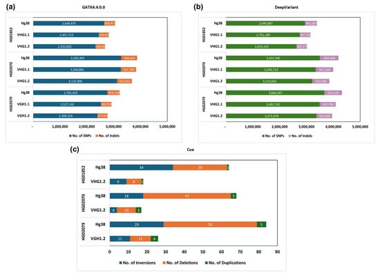 We observed a similar trend across the output of different methods, where the number of SNPs and indels called was reduced when a VHG assembly was used as the reference compared to the hg38 reference (Figure 3a,b, Table S11). This result aligned with previous comparisons of the Han Chinese CN1 and HX1 reference genomes with T2T-CHM13 and hg38, respectively, in variant calling for samples of Chinese descent [20,21], as well as variant calling results using the Korean genome reference KOREF [24]. Polishing our assembly with other KHV genomes also affected the number of called variants, potentially reducing false negatives by using a more population-specific reference. In particular, as the reference instead of hg38, the de novo assembly VHG1.1 reduced the amount of SNP and indel calls by 800,000, and the population-specific VHG1.2 assembly reduced this number by a further 100,000 (approximately 3% of the total called SNPs and indels).