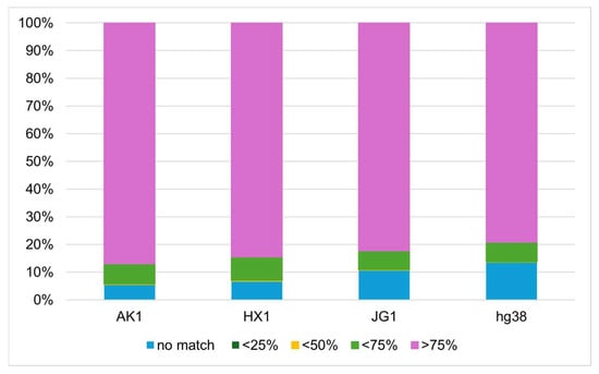 Genome-to-genome alignments revealed that VHG1.2 shares a high degree of similarity with East Asian assemblies, with over 75% identity observed in AK1, HX1, and JG1 as 86.95%, 84.58%, and 82.29%, respectively. The mapping data show the greatest divergence between VHG1.2 and hg38, with only 79.25% of the sequence aligning at >75% identity (Figure 4 and Figure S6, Table S14).
