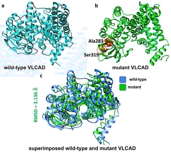 c.848T>C missense variant. This variant is localized in exon 9, causing the substitution of valine with alanine at position 283 (p.Val283Ala). Although not situated within a known binding or active site of the protein, the affected residue lies in an outer loop region, which may influence the protein’s 3d structure. Using Chimera software, we introduced the Val283Ala mutation into the VLCAD protein structure (Figure 1a,b). We aligned the mutant model with the wild-type structure and measured the Root Mean Square Deviation (RMSD) to evaluate how this mutation influenced the protein’s conformation. We observed a structural alteration between the wild-type and mutant forms, with an RMSD value of 3.136 Å (Figure 1c).