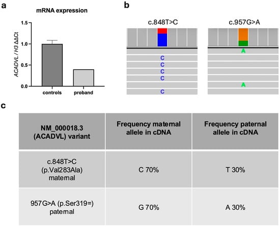 (a) ACADVL gene expression in controls and proband. (b) Allelic distribution from NGS sequencing; the two variants are shown, with histograms indicating allele frequency: blue—C; red—T; green—A; orange—G; example reads containing the C and A alleles are shown. (c) Allele frequency for the nucleotide position 848 and 957.