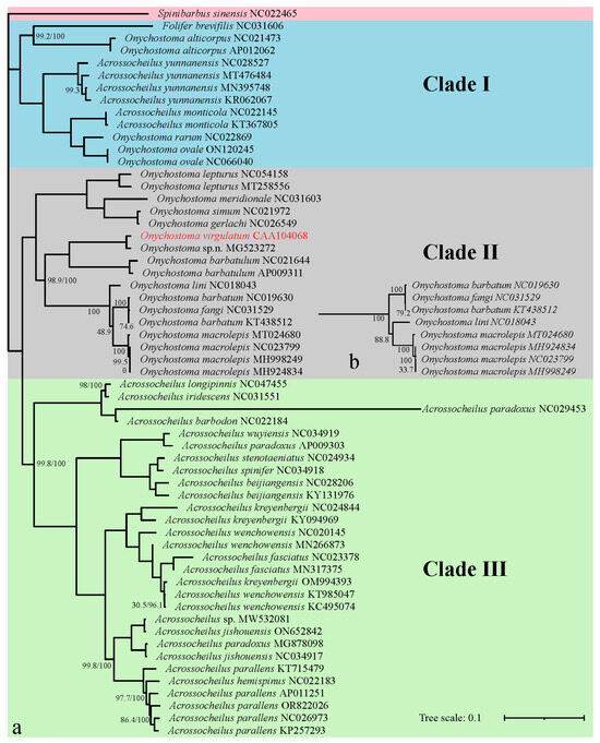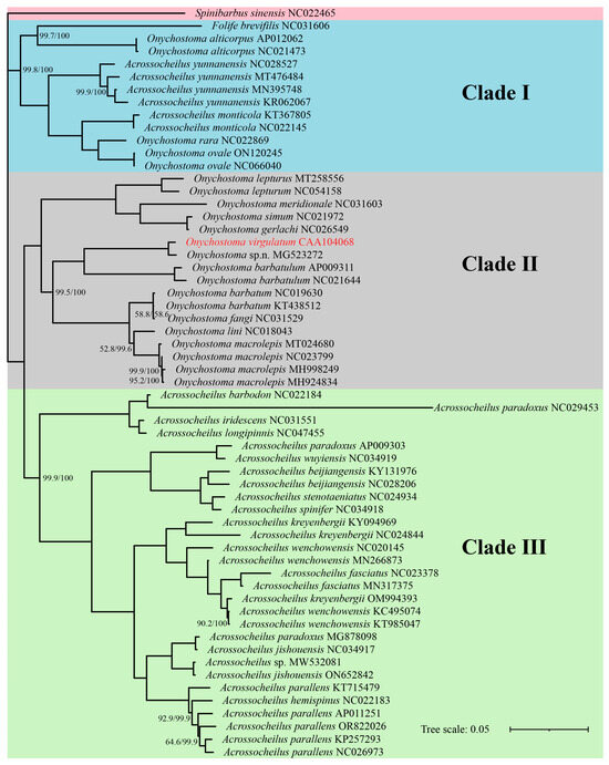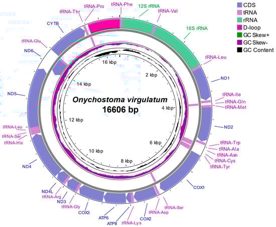 The species appears to exhibit a patchy distribution limited to a few areas, a pattern consistent with many Acrossocheilinae fishes [4,5,6,7,8,9,10,11,12,13,16]. However, current knowledge about the species remains limited and no complete mitochondrial genomes of O. virgulatum have been reported to date. This study aims to supplement the mitochondrial DNA (mtDNA) sequence data of O. virgulatum and, by integrating the existing relevant data, investigate the phylogenetic relationships within the Acrossocheilinae subfamily—Onychostoma, Acrossocheilus, and Folifer.
