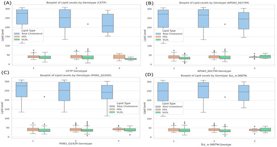 Boxplots of lipid levels (HDL, VLDL, total cholesterol) by genotype. Each panel (A–D) shows the distribution of total cholesterol, HDL, and VLDL levels for the different genotypes of CETP_rs 3764261 (A), APOA5_rs 662799 (B), PON1_Q192R (C), and IL6_rs 1800796 (D). In these boxplots, blue corresponds to total cholesterol, orange represents HDL, and green denotes VLDL. The boxes illustrate the medians (horizontal lines) and interquartile ranges, while the whiskers and any points outside them indicate the variability and potential outliers within each genotype group.