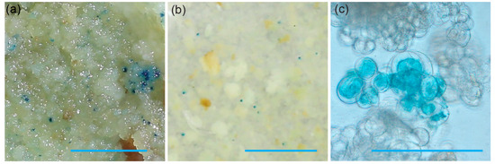 Transient iGUS expression assays in friable embryogenic callus after (a) biolistic and (b) Agrobacterium-mediated transformation using the pCAMBIA1305.1 plasmid. The scale bar on both (a) and (b) images is 5 mm. Micrograph (c) shows a single cluster of friable embryogenic callus expressing iGUS three days after co-cultivation with Agrobacterium. The scale bar is 20 µm.