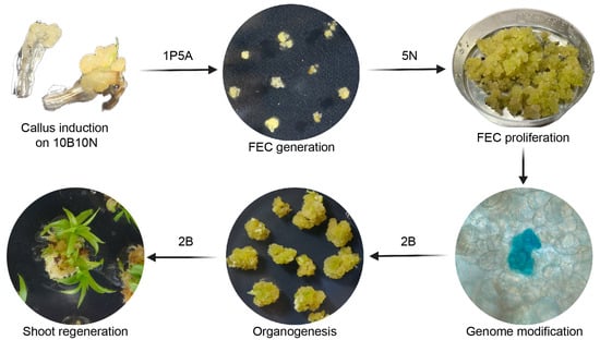 Tissue culture workflow for the 73–50 cultivar. Dedifferentiated callus is induced from the white leaf base on 10B10N medium. Friable embryogenic callus suitable for genetic manipulations is generated on 1P5A medium. FEC can be maintained and proliferated on 5N medium. At this stage, FEC can be used for transformation of DNA-free editing manipulations. Organogenesis and shoot regeneration are achieved on 2B medium.