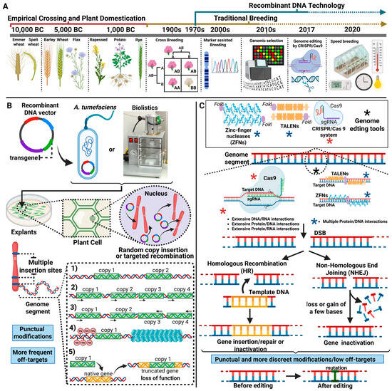 (A): Timeline of main advances in technology for producing more productive plants for agriculture. (B): After cloning of transgene in DNA vector, genetic transformation methods, such as indirect transformation mediated by A. tumefaciens and direct transformation by Biolistics can be used to obtain GM plants. The in vitro introduction of genes into plant explant cells by both methods can be random or mediated by site-directed recombination. In the first case, insertions of transgene copies into multiple genomic sites frequently occur, which can result in one or more phenomena such as: (1) low number of integrated copies in a locus of high gene expression; (2) transcriptional gene silencing by integration of multiple copies of the transgene in tandem; (3) post-transcriptional silencing resulting from integration of multiple copies in inverted orientations; (4) recombination of the transgene in a heterochromatin region associated with low expression levels; and (5) knockout of a native plant gene. (C): Use of genome editing technologies to increase the precision of insertion of transgene copies into previously mapped sites of high gene expression or to induce indel-type mutations. ZFNs, TALENs and the CRISPR/Cas9 system are based on the biosynthesis of specialized nucleases capable of catalyzing the production of a severe lesion at the target genomic site characterized by the cleavage of the two DNA strands, called a double strand break (DSB). After the production of the lesion, two DNA repair mechanisms can be activated: direct homologous recombination (HDR)–when a DNA fragment with complementary and homologous ends to the edges of the DSB is offered for recombination at the editing site, and the non-homologous end joining (NHEJ) pathway, responsible for causing mutations by deletion of bases for the restoration of continuous strands at the DSB site. In both cases, editing is represented by discrete modifications at the genomic level and a low level of off-targets. Created with BioRender.com (https://www.biorender.com/).