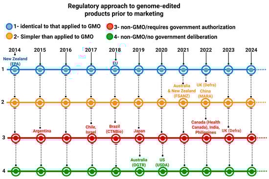 In general, the regulatory frameworks for GMOs and edited organisms differ from country to country [,,,]. There are four categories of countries based on the level of regulatory restrictions regarding the commercial release of edited organisms: (1) countries in which the regulatory framework is identical for edited organisms and GMOs (countries with more restrictive regulatory frameworks); (2) countries in which the regulatory framework for edited organisms is similar to that of GMOs but is occasionally simpler; (3) countries whose regulatory framework allows edited organisms obtained through specific approaches to be considered non-GMOs, whose regulatory framework is extremely simpler than that of GMOs, but whose commercial release depends on prior approval by a public institution/government agency; and (4) countries in which edited organisms are considered non-GMOs and do not depend on government approval for commercial release [,]. With the publication of RN16 and the possibility of obtaining mutant organisms edited by SDN-1 and SDN-2, Brazilian regulatory framework positioned the country in category 3 (Figure 3).