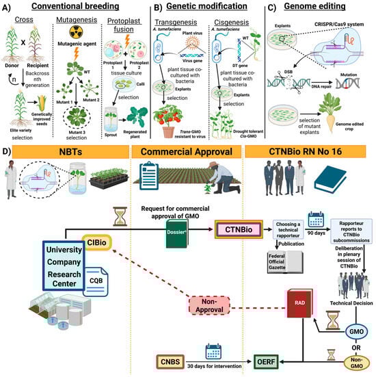 Strategies for obtaining plant variability to be explored in plant breeding programs: (A) Spontaneous mutants can be selected for crosses to obtain more productive individuals. Induced mutations can produce new alleles of interest for genetic improvement. Protoplast fusion contributes to increasing chromosomal variability in polyploid cells. (B) Transgenic or cisgenic GM plants with new phenotypes of interest are widely used in Brazilian agriculture. (C) The CRISPR/Cas9 editing system is the main genome editing technology. Depending on the editing approach, the final product obtained can be classified as GMO or non-GMO. (D) The set of steps of the process of approval and commercial release of products generated by NBTs provided for in the Brazilian regulatory framework. Created with BioRender.com.