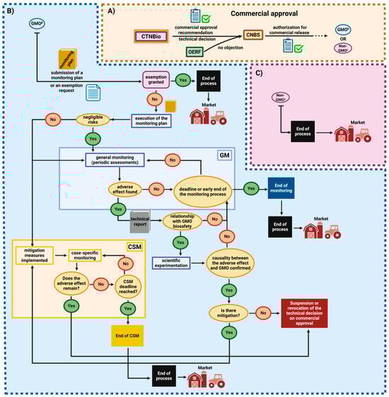 Regulatory process after commercial approval of GMO and non-GMO technologies carried out by CTNBio. (A) After the technology has been classified and approved for commercial release, if there is no objection by the CNBS or the OERFs, the product may follow two procedures, depending on its legal nature. (B) If the technology is a GMO and an exemption request is denied, it will be submitted to the monitoring plan. Depending on the results observed, the product may be released for the market or commercial approval may be suspended. (C) If the technology is a non-GMO, it may already be licensed and commercialized without the need for monitoring. Adapted from CTNBio []. Created with BioRender.com.