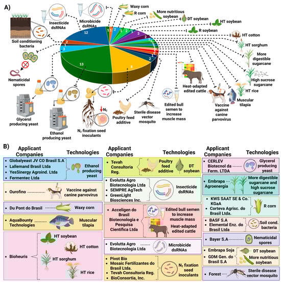 (A) Technologies obtained with NBTs whose commercial release requests were submitted to CTNBio between 2018 and 2024. (B) Technologies developed by NBTs listed by their respective developer companies []. R insect resistant; HT herbicide tolerant; DT drought tolerant; dsRNA double-stranded RNA. Created with BioRender.com.