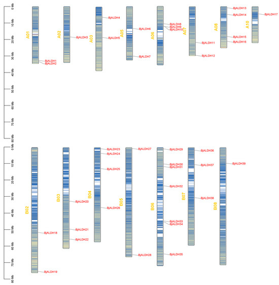 Identification of the BjALDH conserved domains using NCBI-CDD and Pfam tools finally identified the 39 BjALDH family members, which were named BjALDH1~BjALDH39 according to the order of their position on the chromosome, and located on 15 chromosomes. Of these, one BjALDH was on chromosomes A02, A10, and B08, two were on chromosomes A01, A03, A05, A07, B02, and B05, three were on chromosomes A06 and B03, four were on chromosomes A08 and B04, and seven were on chromosome B06 (Figure 1).