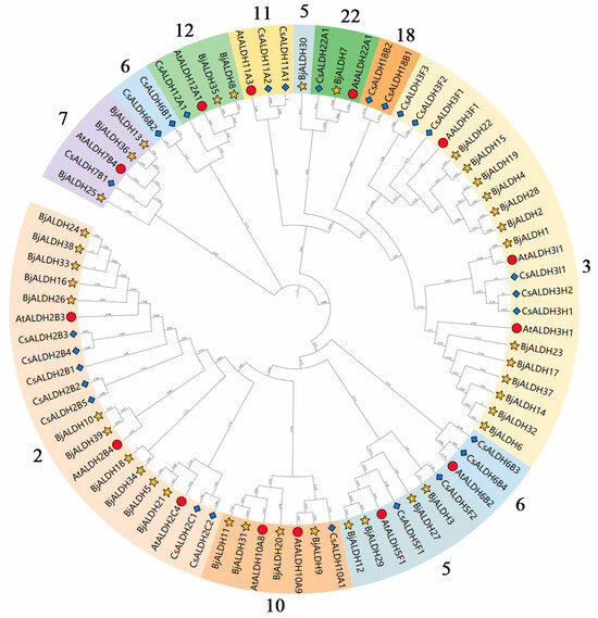 The phylogenetic tree of the ALDH proteins from A. thaliana (At), C. sinensis (Cs), and B. juncea (Bj). Different colors represent different subfamilies, numbers represent the numbering of each subfamilies, yellow stars represent ALDHs from Bj, red circles represent ALDHs from At, and blue diamonds represent ALDHs from Cs.