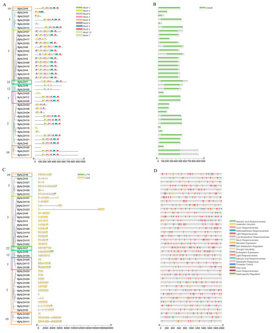 Conserved motifs of the B. juncea ALDH family (A), conserved domains (B), gene structure (C), and promoter cis-regulatory elements (D) analysis.