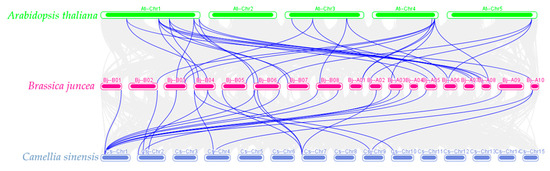 The collinearity relationship of ALDH genes between A. thaliana, B. juncea, and C. sinensis.