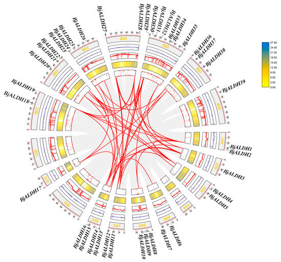 The results of the BjALDH collinearity analysis showed 37 pairs of collinity genes located in the species (Figure 5), such as BjALDH2–BjALDH4, BjALDH8–BjALDH35, BjALDH11–BjALDH20, and BjALDH12–BjALDH27.