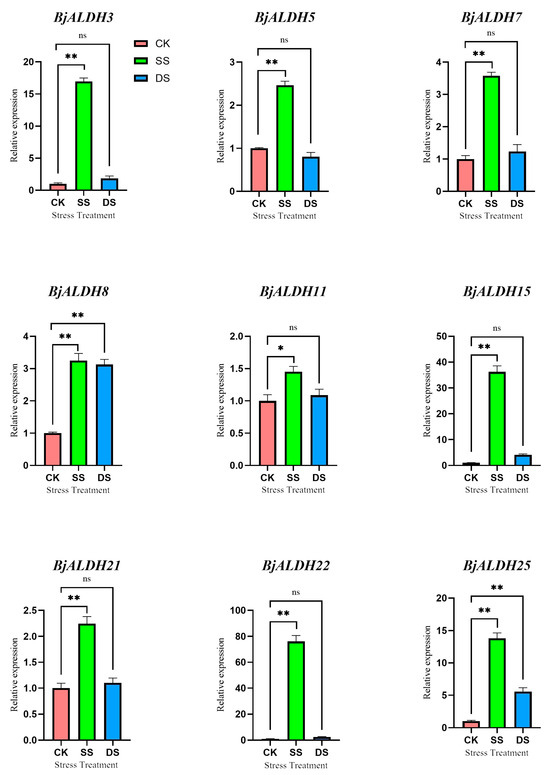 Non-biological stress-induced expression patterns of BjALDH. The x-axis represents various treatments of B. juncea. The y-axis indicates relative expression levels, calculated using the 2−∆∆Ct method. CK: normal; SS: salt stress; DS: drought stress; ** significant differences between treatments at p < 0.01; * significant differences between treatments at p < 0.05; ns: no significant difference. Data represent the mean ± SD for three biological replicates (n = 3).