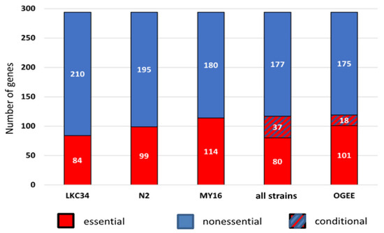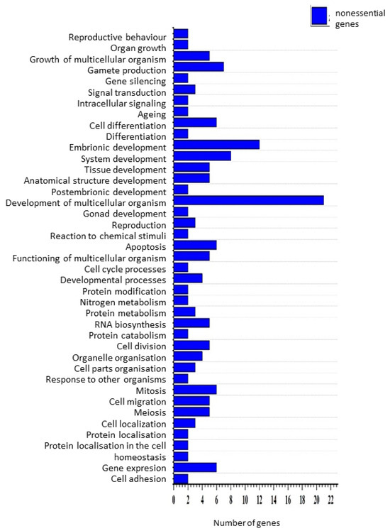 - Ramani, A.K.; Chuluunbaatar, T.; Verster, A.J.; Na, H.; Vu, V.; Pelte, N.; Wannissorn, N.; Jiao, A.; Fraser, A.G. The majority of animal genes are required for wild-type fitness. Cell 2012, 148, 792–802. [Google Scholar] [CrossRef]