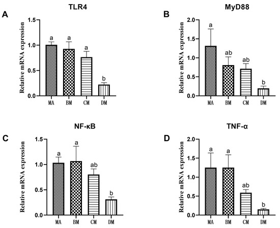 Effects of ferulic acid on the relative mRNA expression levels of (A) TLR4, (B) MyD88, (C) NF-κB, and (D) TNF-α. Note: In each histogram, bar charts with different letters indicate statistically significant differences between groups (p < 0.05 or p < 0.01); There was no significant difference in the bar charts with common letters (p > 0.05).