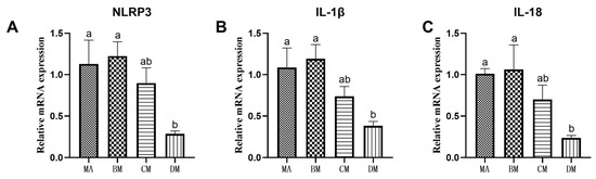 As shown in Figure 1 and Figure 2, compared to the MA group, the mRNA expression levels of TLR4, MyD88, NF-κB, TNF-α, NLRP3, IL-1β, and IL-18 in the DM group were significantly reduced.