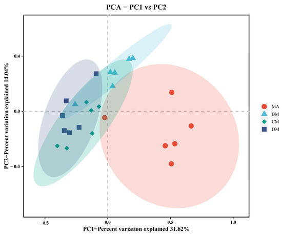 As shown in Table 6, compared to the MA group, there were no significant differences in the ACE index, Chao1 index, Simpson index, and Shannon index in the ferulic acid group, while the Faith_PD index in the DM group was significantly increased. As illustrated in Figure 3, there is a clear separation trend among the BM group, CM group, DM group, and MA group. The above results indicate that ferulic acid alters the diversity of the cecal microbiota.