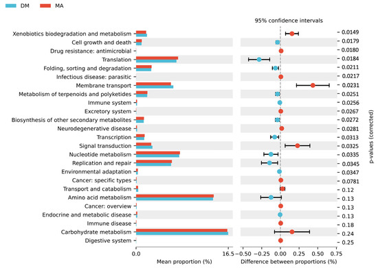 Using PICRUSt2 software (V2.5.2) to analyze the differences in the KEGG metabolic pathways, as shown in Figure 6, compared to the MA group, the functional genes of the microbial community in the DM group significantly increased in metabolic pathways such as xenobiotics biodegradation and metabolism, membrane transport, excretory system, and signal transduction. In contrast, there was a significant decrease in metabolic pathways related to cell growth and death, translation, folding, sorting and degradation, metabolism of terpenoids and polyketides, transcription, nucleotide metabolism, and replication and repair (p < 0.05). These results indicate that feeding high doses of ferulic acid alters the metabolic functions of the cecal microbiota in broiler chickens.