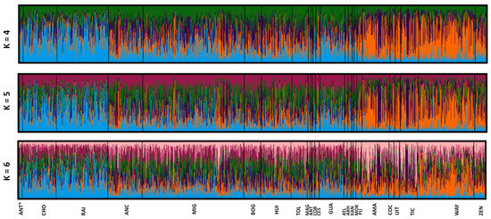 - Pritchard, J.K.; Wen, X.; Falush, D. Documentation for structure software: Version 2.3. Univ. Chicago 2010, 6, 321–326. [Google Scholar] [CrossRef]
