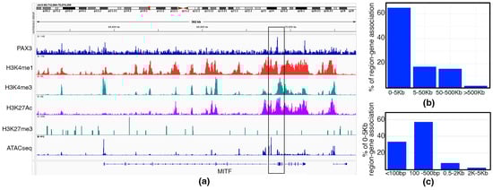 Analysis of SK-MEL-5 cell cistromic signatures. (a) Example of CUT&RUN and ATAC-seq data at the MITF locus, MACS2 peak (boxed), with antibodies against PAX3, H3K4me1 (Active enhancer), H3K4me3 (Active promoter), H3K27Ac (Active chromatin), H3K27me3 (Repressed chromatin).; (b,c) distance of PAX3 peaks from TSS, shown as the percentage of total peaks (b) and the total percentage of peaks 0–5 Kb from the TSS (c).