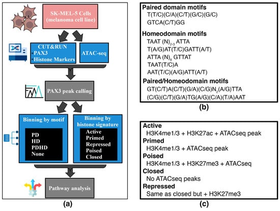 For this analysis, an in-house bioinformatic approach to examine PAX3 regulatory enhancers in terms of PAX3 binding motifs and histone signatures was employed (Figure 2a). First, the PAX3 peaks were identified, and then paired with the presence or absence of a PAX3-binding site within the peak (binning by motif), or with histone PTM tags and ATAC-seq peaks (binning by histone signature). For binning by motif, PAX3 has two DNA binding domains, PD and HD. How PAX3 interacts with DNA, and what cofactors cooperate on enhancers, differs between the PD and HD [1]. PAX3 peaks were sorted using custom R scripts containing PAX3 binding sites based on previously identified PD, HD, and dual PDHD sites [34,69,70,71,72,73,74,75,76,77] or peaks containing none of these sequences (Figure 2b). The PD binding site is difficult to predict due to the wobbly binding preferences of this domain, but has been determined through binding site selection assays, electrophoretic mobility shift assays, and DNA binding interference experiments [34,70,71,73,78]. The major HD site found in PAX family proteins is TAAT (N)2–3 ATTA, but there are several minor sites identified (referred to as HDminor, HD half-sites, H.12) identified for PAX3 and other PAX proteins through in vitro assays and crystal structure analysis [75,76]. While the PD and HD often bind independently, there is also evidence of crosstalk during DNA binding of either domain, as well as enhancer elements with dual PDHD sites. While many of the PDHD sites identified show a high binding affinity by the translocation product PAX3-FOXO1 or paralog PAX7, there is evidence that PAX3 can interact with PDHD sites as well, including the HP.E0 pioneer site [72,74,77]. For binning by histone signature, gene and promoter regions proximal to PAX3 peaks were classified as Active, Poised, Primed, Repressed, or Closed based on histone marks and accessibility (ATAC-seq) using previously identified signatures (Figure 2c) [79,80,81,82].