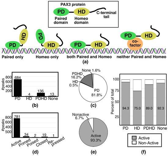 PAX3 binds to DNA primarily through the Paired Domain on enhancers affiliated with active genes. (a) Schematic representing the definition of PD, HD, PDHD, and None peaks; (b,c) number (b) or percentage (c) of peaks containing motifs for PD, HD, or PDHD, or none of these sites.; (d,e) number (d) or percentage (e) of peaks identified as Active, Primed, Poised, Closed, or Repressed chromatin; (f) percent of each peak identified as PD, HD, PDHD, or None that have Active (grey) or Non-Active (white) chromatin.