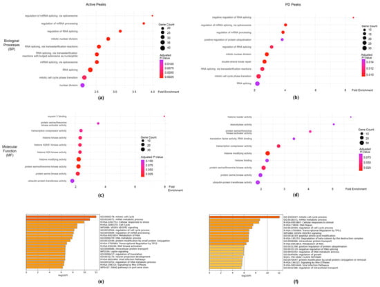 Pathway analysis of genes associated with PAX3 cistromic peaks. (a,b) Top 10 Gene Ontology (GO) pathways in Biological Process (BP) pathways for Active (a) and PD (b) groups; (c,d) GO pathways for Molecular Function (MF) for Active (c) and PD (d) groups.; (e,f) top 20 ontological terms from Metascape [66].