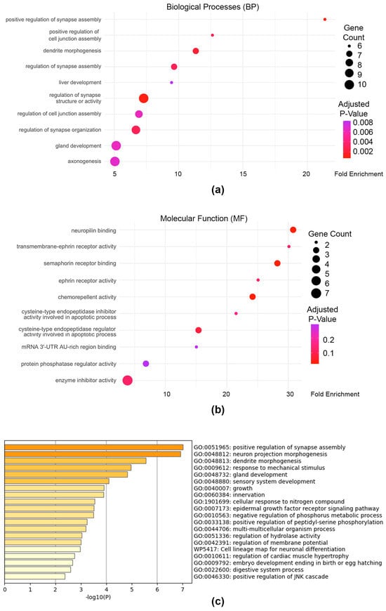 Since 13.1% of the PAX3 peaks were found to be ≥50 Kb from the TSS of the genes they annotated to, we performed separate GO-based pathway enrichment analyses to determine the pathways they influenced (Figure 6, Supplementary Table S5 and S6). Interestingly clusterProfiler GO:BP analysis found that the Distant gene set comprising distal PAX3 enhancers was significantly overrepresented in biological processes associated with neuronal development, cell adhesion, junction regulation, and developmental processes (Figure 6a,b). Meanwhile GO:MF analysis revealed enrichment for several signaling and regulatory activities such as neuropilin and ephrin receptor binding and semaphorin receptor activity. Metascape-based BP pathway enrichment analysis also found significant gene set overrepresentation in neuronal development, synaptic organization, and tissue morphogenesis pathways, which was a large departure from the Active and PD results (Figure 6c). These results suggest that genes with distal PAX3 enhancers ≥50 Kb from TSS coordinate neuronal differentiation, tissue development, and adaptive signaling processes, and may reflect a reactivation of neural crest-derived programs.