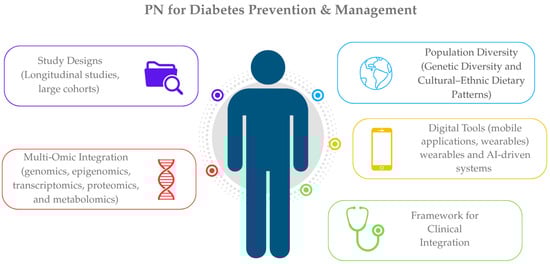 Looking forward, future research must prioritize large-scale, multi-ethnic, and longitudinal studies that leverage advanced omic and digital technologies. Such efforts are essential not only for validating G × D interactions but also for translating them into actionable and scalable public health strategies aimed at T2DM prevention and management through PN (Figure 1).