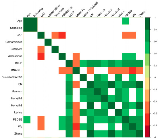Heatmap of correlations between sociodemographic, clinical characteristics and epigenetic age in psychiatric patients. The heatmap colors correspond to the significance (p < 0.05): green indicates a positive correlation, and red indicates a negative correlation. Blank spaces indicate no significant correlation. Best Linear Unbiased Prediction clock (BLUP); DNA methylation-based telomere length (DNAmTL); Dunedin Pace of Aging Methylation (DunedinPoAm38); Elastic Net clock (EN); global assessment of functioning (GAF); Horvath clock (multi-tissue, Horvath-1); Horvath clock (skin and blood, Horvath-2); Levine clock (PhenoAge); Pediatric Buccal Epigenetic clock (PedBE).
