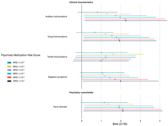 Epigenetic biomarkers could serve as predicting tools for psychosis [29], and currently there is no epigenetic biomarker for EOP. We constructed the EOP-MRS to associate the biomarker with sociodemographic and clinical characteristic in children and adolescent Mexican patients with EOP. Our findings show that panic disorder, auditory hallucinations, and visual hallucinations were associated with a higher MRS using five different p-value thresholds: MRS1×10−1 (β = 2.10, CI 95 = 0.53–4.70; β = 2.26, CI 95 = 0.63–4.93; β = 1.93, CI 95 = 0.47–4.31; respectively); MRS1×10−2 (β = 2.08, CI 95 = 0.55–4.64; β = 2.21, CI 95 = 0.63–4.85; β = 1.90, CI 95 = 0.47–4.23; respectively); MRS1×10−3 (β = 1.92, CI 95 = 0.50–4.23; β = 1.96, CI 95 = 0.54–4.31; β = 1.78, CI 95 = 0.44–3.94; respectively); MRS1×10−4 (β = 1.91, CI 95 = 0.52–4.16; β = 1.73, CI 95 = 0.45–3.78; β = 1.54, CI 95 = 0.33–3.39; respectively); and MRS1×10−5 (β = 1.36, CI 95 = 0.28–2.95; β = 1.28, CI 95 = 0.23–2.82; β = 1.22, CI 95 = 0.19–2.69; respectively). Furthermore, a higher MRS was associated with tactile hallucinations (MRS1×10−5, β = 1.59, CI 95 = 0.25–3.48), and negative symptoms (MRS1×10−1, β = 1.99, CI 95 = 0.48–4.46; MRS1×10−2, β = 1.71, CI 95 = 0.37–3.87) (Figure 3). Three out of six thresholds (MRS1×10−5, MRS1×10−2, and MRS1×10−1) predicted three clinical manifestations of psychosis and one psychiatric comorbidity. Our results shows that our EOP-MRS may be an indicator for visual and auditive hallucinations in Mexican children and adolescent patients.