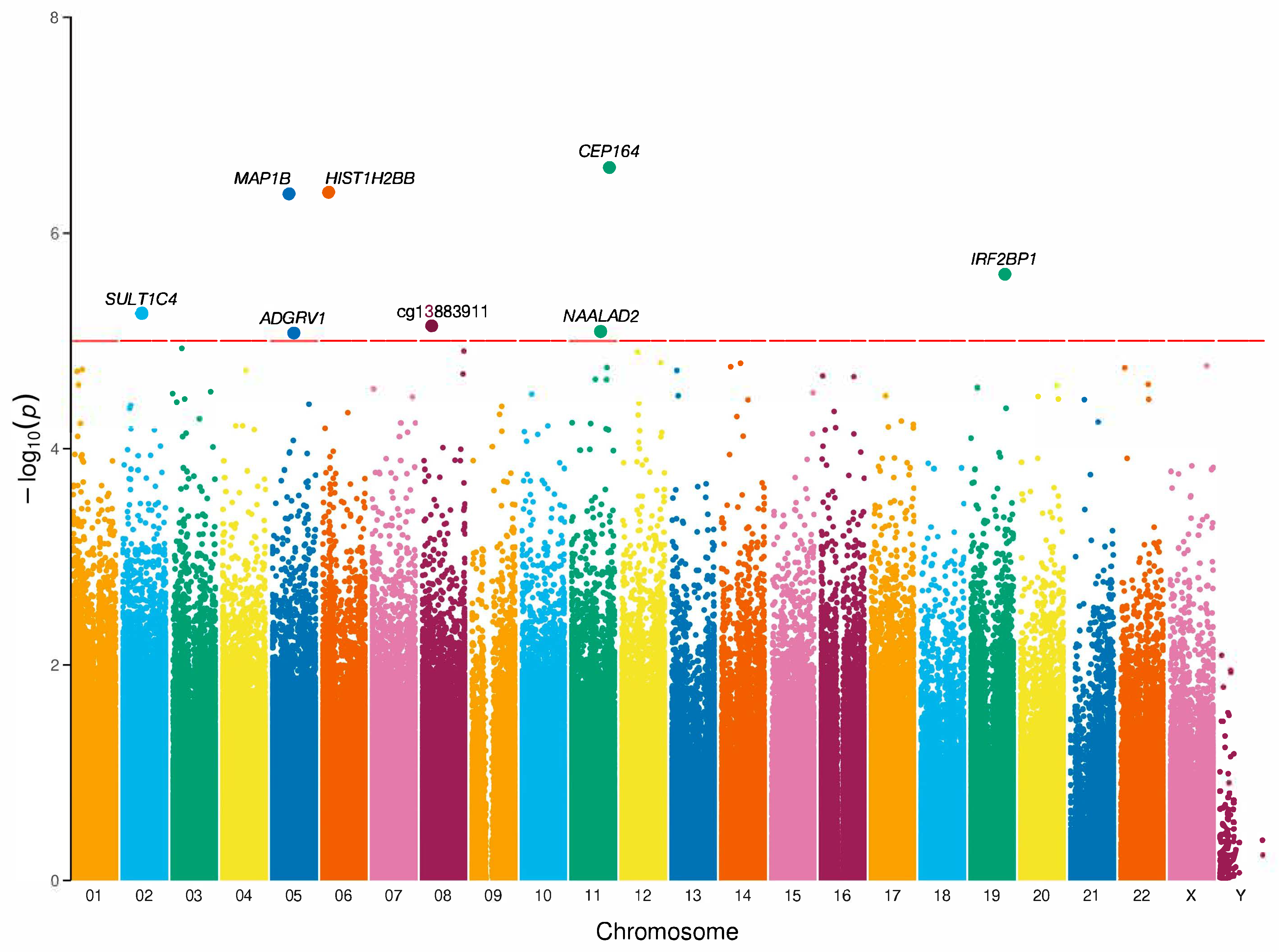 Manhattan plot of EWAS analysis in EOP. Manhattan plot of CpG sites and p-values. The X-axis represents the chromosome position, and the Y-axis represents −log10(p). The red horizontal line parallel to the X-axis denotes nominal significance (p < 1 × 10−5). All loci with a p-value < 1 × 10−5 are annotated to genes according to the human genome assembly (hg19). The association models are adjusted for sex, age, and five surrogate variables. Adhesion G Protein-Coupled Receptor V1 (ADGRV1); Histone Cluster 1 H2B Family Member B (HIST1H2BB); Centrosomal Protein 164 (CEP164); Interferon Regulatory Factor 2 Binding Protein 1 (IRF2BP1); Microtubule-Associated Protein 1B (MAP1B); N-Acetylated α-Linked Acidic Dipeptidase 2 (NAALAD2); Sulfotransferase Family 1C Member 4 (SULT1C4). λ = 0.9783.