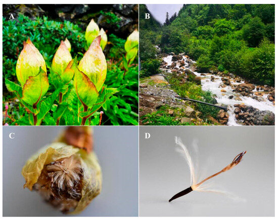 Saussurea DC. is one of the largest genera in the Asteraceae family, with more than 500 species found in the northern hemisphere [1]. S. obvallata (DC.) Edgew., a perennial hermaphrodite herb of the Asteraceae family, is endemic to the Qinghai–Tibet Plateau (QTP), thriving at altitudes between 3200 and 4700 masl. S. obv is commonly found in alpine screes, alpine meadows, rocky slopes, shrubs, and near streams [2,3]. The stones and shrubs can shield S. obv from strong wind, allowing it to achieve an average height of 50–80 cm. S. obv blooms from July to September. It is a typical “greenhouse plant”. The light-yellow bracts envelop flowers, thus protecting them from UV light and retaining heat at night (Figure 1A), attracting insects for cross-pollination. By September and October, the fruits will gradually mature, and the bracts will open (Figure 1C). The fruits with pappi (Figure 1D) are dispersed by wind and grow in suitable habitats [4]. During winter, the above-ground parts wither, and the roots will regenerate in the following spring [5].