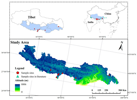 Seven genetically distinctpopulations of S. obv were sampled across the Xizang Autonomous Region from July–August 2022, maintaining minimum interpopulation distances >50 km andintrapopulation sampling intervals > 20 m to minimize kinship bias, as illustrated in Figure 2. Figure 2 also indicatesthe locations of S. obv sampling sites reported in the previous literature [40,41,42,43]. Detailed geographical characteristics were described in Table 1. Compared with Lhasa, the habitats of S. obv are much more humid. There are streams flowing near the habitats. The communities of all seven sapling sites are similar, mainly composed of Rhododendron spp., Rhodiola rosea, Dasiphorafruticosa, MeconopsisVig., Bistorta macrophylla, and other plants.