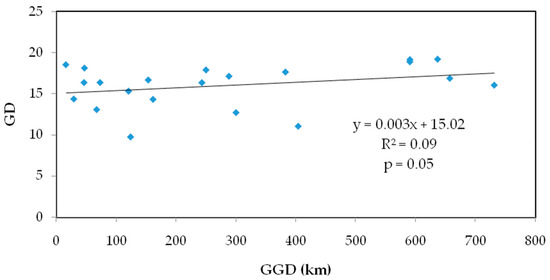 The values of seven populations of S. obv ranged from 0.4583 to 0.8167 (Table 5), only one of which was below 0.5, indicating low genetic differentiation among S. obv populations. Mantel test showed that there was a significant correlation between genetic distance and geographical distance (Figure 4).