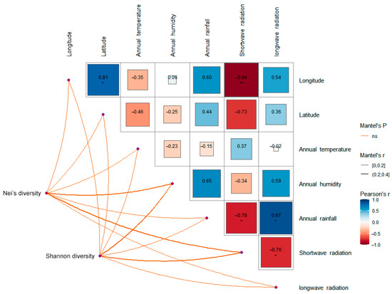 Correlation analysis between genetic diversity and climatic factors of seven populations of S. obv. * p < 0.05, ** p < 0.01.
