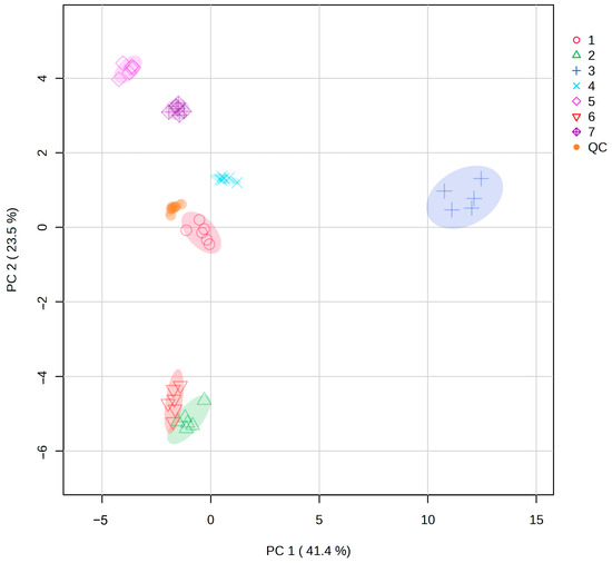 Metabolites of different populations of S. obv were analyzed by PCA, and the results areshown in Figure 7. All QC samples were gathered together, indicating the reliability of the results. The samples within the population showed good reproducibility, while most inter-population samples demonstrated clear separation in metabolite profiles, except for a minor overlap between Population 2 and Population 6.