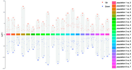 Differential metabolites between every two populations of S. obv. Note: The red/blue numbers are the number of upregulated/downregulated differential metabolites in each comparable group.