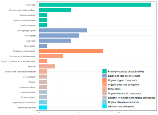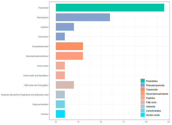 All screened differential metabolites were annotated to the HMDB database (Figure 9). The metabolites were divided into nine categories, including phenylpropanoids and polyketides, lipids and lipid-like molecules, organic oxygen compounds, organic acids and derivative, benzenoids, organoheterocyclic compounds, lignans, neolignans and related compounds, organic nitrogen compounds, alkaloids, and derivatives. The largest number of metabolites is flavonoids (14 in total).