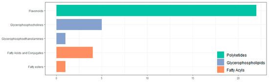 All screened differential metabolites were annotated to the LIPID MAPS database (Figure 11). The metabolites were divided into three categories, including polyketides, glycerophospholipids, and fatty acyls. The largest number of metabolites is flavonoids (22 in total).