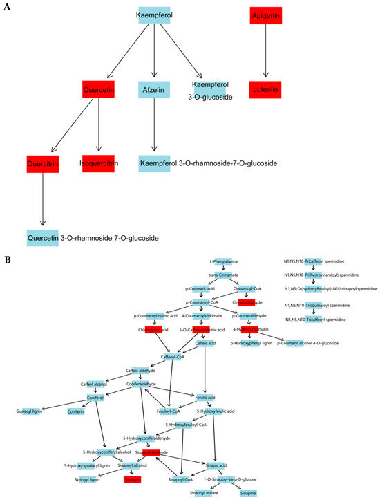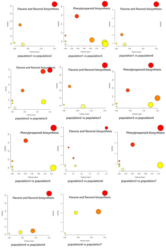 The results of KEGG pathway-enrichment analysis are shown in Figure 12. The comparison groups with too little annotation information to enrich the pathways or those that did not meet the conditions of significantly enriched pathways were eliminated. In the effective comparison groups, flavone and flavonol biosynthesis and phenylpropanoid biosynthesis were the most significantly enriched pathways. These results indicated that the differential metabolites were mainly related to these two pathways (Figure 13).