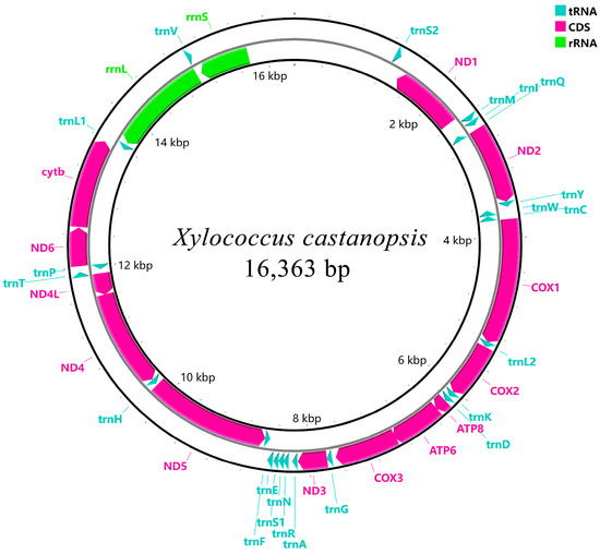 Following the removal of adapters and low-quality reads, we obtained approximately 12 GB of clean data and assembled it for reference-guided assembly using NOVOPlasty v4.3.3 [19], with the mitochondrial genome of Matsucoccus matsumurae as the reference and the COX1 sequence of X. castanopsis serving as a bait. This process successfully yielded a mitogenome of 16,363 bp. Then, annotated using the MITOS v2.1.9 on the Galaxy platform, the accurate boundaries of protein-coding genes (PCGs) were confirmed by comparison with other scale insects using MEGA 7.0.26 [20,21]. Six tRNA genes (trnA, trnQ, trnL1, trnS2, trnW, and trnV) were not identified by MITOS v2.1.9; however, they were successfully detected using the manual method and ARWEN v1.2 [22]. The rrnS was detected by MITOS v2.1.9, and the rrnL was determined by the upstream and downstream of tRNAs and alignment with the other scale insects.